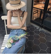 キャミソールとロング丈のデニムスカートのセットアップ。