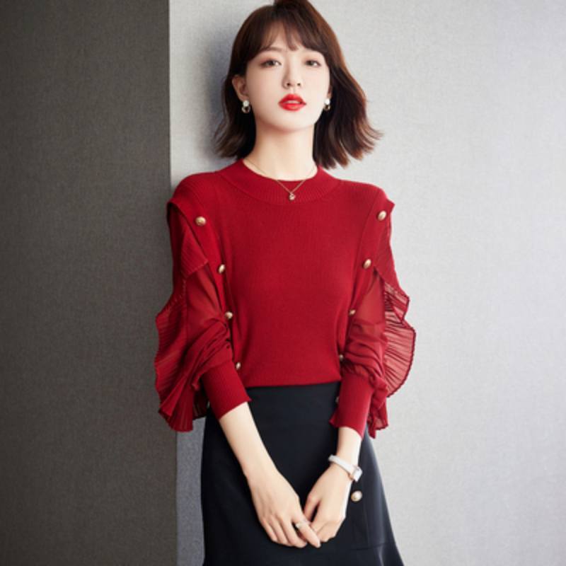 トップス シャツ ブラウス 袖あり 長袖 クルーネック プリーツ シフォン リブニット ボタン ニット かわいい 大人可愛い きれいめ シンプル カジュアル 大人 上品 おしゃれ お洒落 清潔感 大人女子 キュート ガーリー 個性的 エレガント 抜け感 フェミニン 華やか 無地 春 秋 20代 30代 40代 レディース 女性用 デート お出かけ 普段使い モテ S M L XL 2XL 赤 レッド | ATAOI