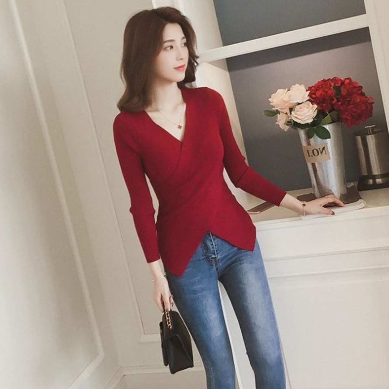 深めのVネックがスタイルをよくみせてくれる長袖トップスです。