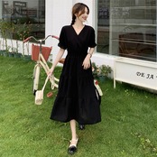 ワンピース ティアードワンピース ロング丈 袖あり 半袖 Vネック 襟なし Aライン かわいい 大人可愛い きれいめ シンプル カジュアル 大人 上品 おしゃれ かっこいい 大人可愛い 大人女子 こなれ感 ラブリー キュート モダン 無地 春 秋 10代 20代 30代 レディース 女性用 通勤 学生 デート お出かけ 女子会 休日 着回し 普段使い 韓国系 コーデ スタイル フリーサイズ ブラック | ATAOI