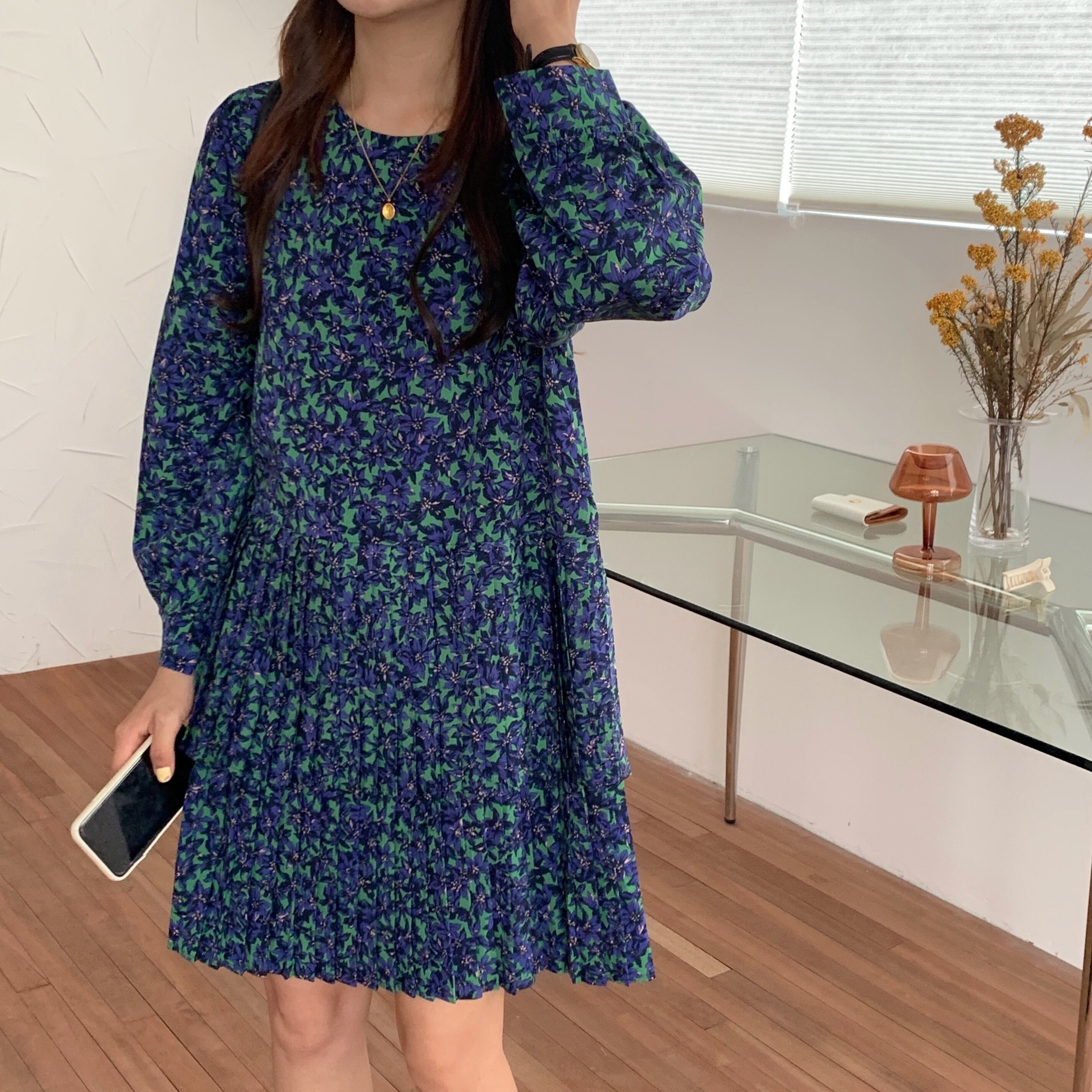 プリーツワンピース ブルー ワンピース 膝丈 ひざ丈 袖あり 長袖 ラウンドネック 襟なし プリーツ かわいい 大人可愛い きれいめ 大人 上品 おしゃれ お洒落 レトロ 清楚 大人女子 ラブリー キュート ガーリー エレガント 存在感 シック 柄 花柄 小花柄 フラワー 春 秋 冬 ロングシーズン 20代 30代 40代 レディース 女性用 デート お出かけ 女子会 パーティー イベント ホテル レストラン お呼ばれ お茶会 ランチ ショッピング 着回し 普段使い 重ね着 モテ フリーサイズ | ATAOI