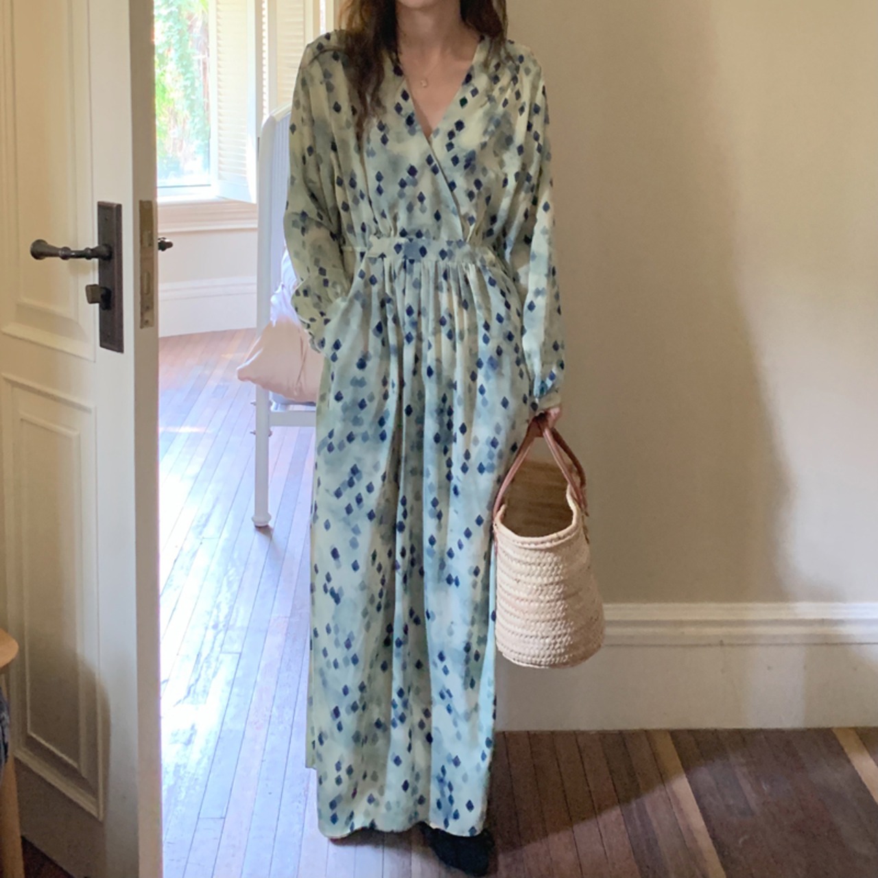 ロングワンピース ワンピース 膝下 ロング ロング丈 袖あり 長袖 Vネック カシュクール 襟なし ウエストマーク ハイウエスト かわいい 大人可愛い きれいめ 大人 上品 おしゃれ お洒落 清楚 大人女子 ラブリー キュート ガーリー 存在感 爽やか 柄 春 秋 冬 10代 20代 30代 40代 レディース 女性用 学生 デート お出かけ 女子会 レストラン お呼ばれ お茶会 ランチ ショッピング 着回し 普段使い 重ね着 モテ 美脚 脚長 細見え スタイルアップ 華奢見え フリーサイズ | ATAOI