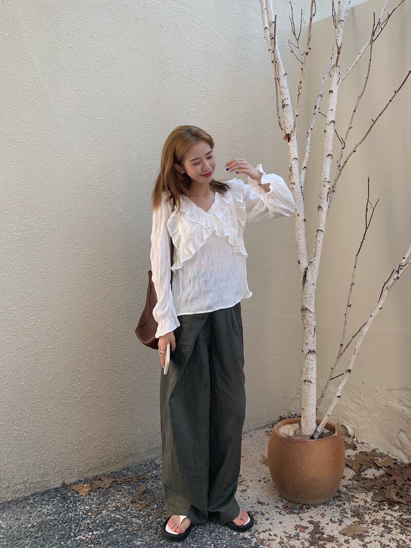 パンツスタイルにも合わせやすいガーリーな1着です。